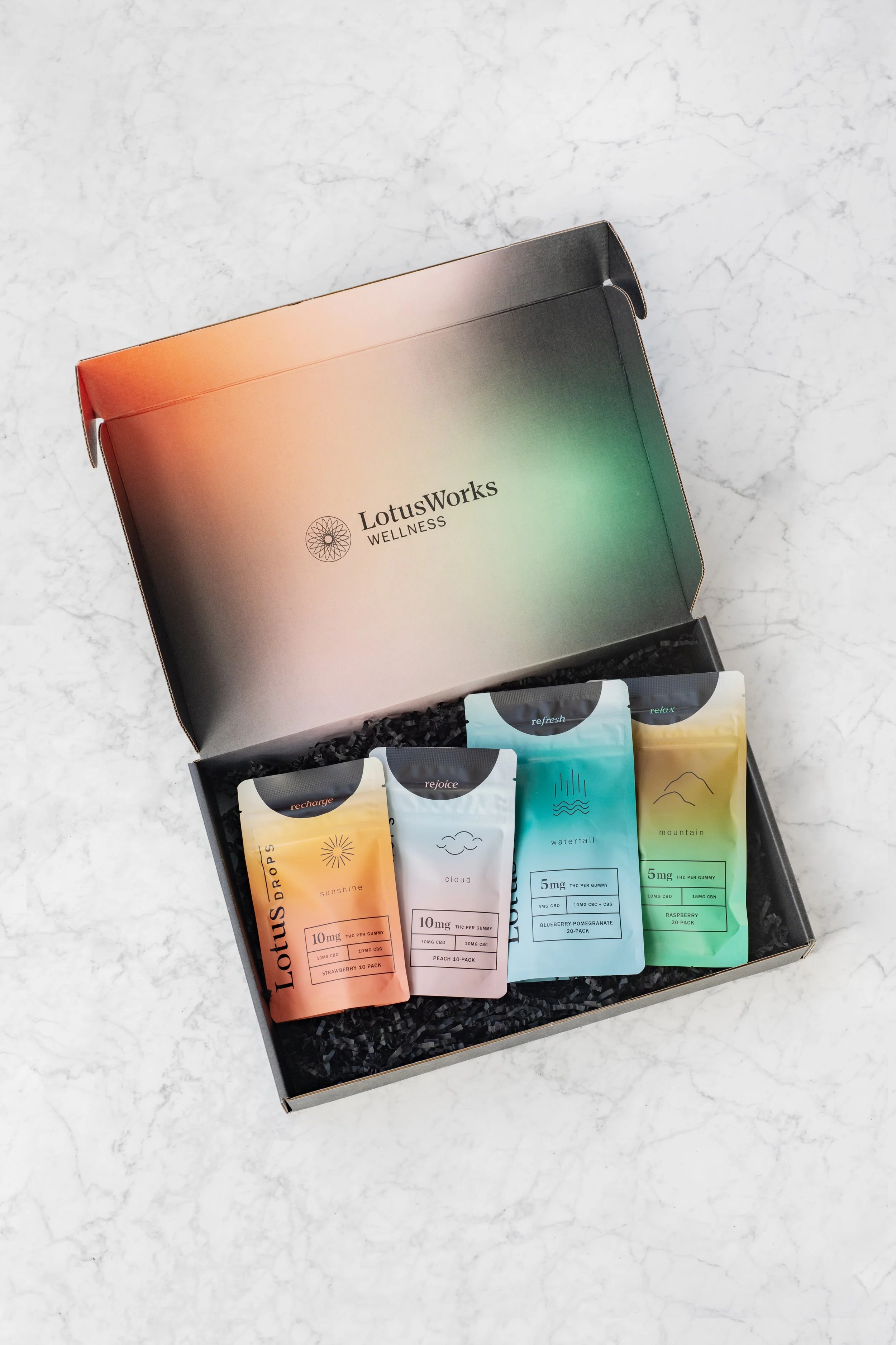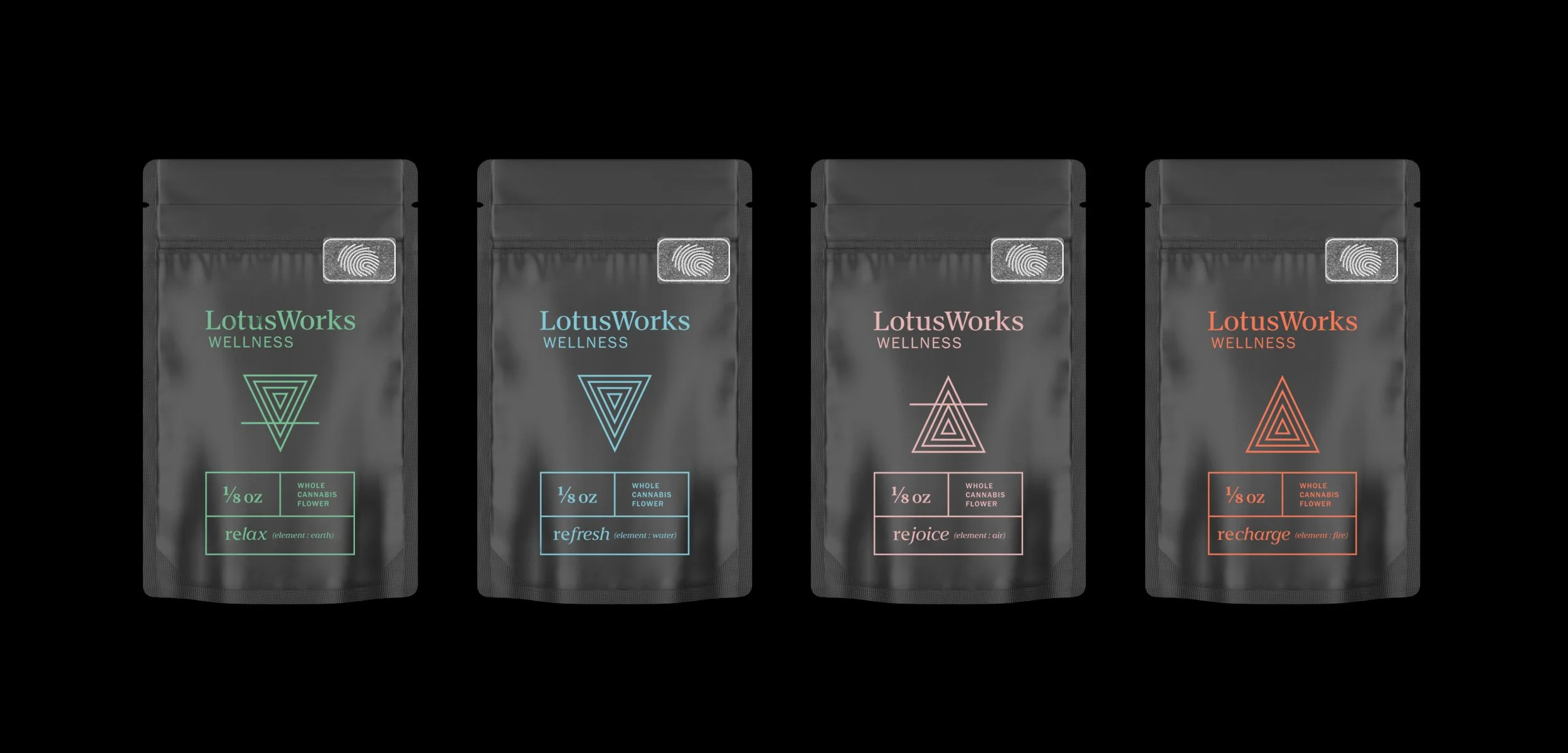 For the packaging, they wanted to open shop with flower and pre-rolls in the four strains, which stylistically connected to the four “re-” categories. We then conceptualized multipacks, for which I created vibrant packaging systems connected to the color code system, but with different flair based on the pack, combo, and size (soon to be implemented!). We then developed LotusDrops, a sub-brand encompassing all tinctures, gummies and vapes. I created a set of LotusDrops identities - four icons and gradient color combinations for each flavor in the four categories - similar to the strain identities. This packaging is slightly more playful than the standard packaging, but all within the same LotusWorks universe.